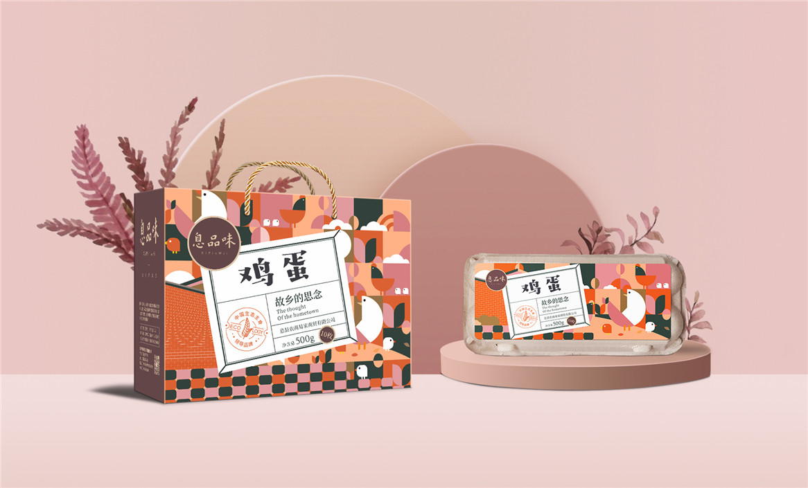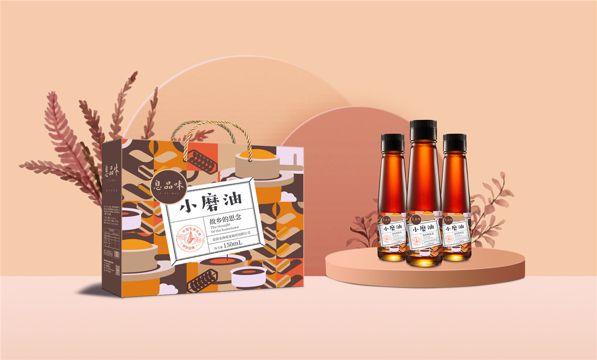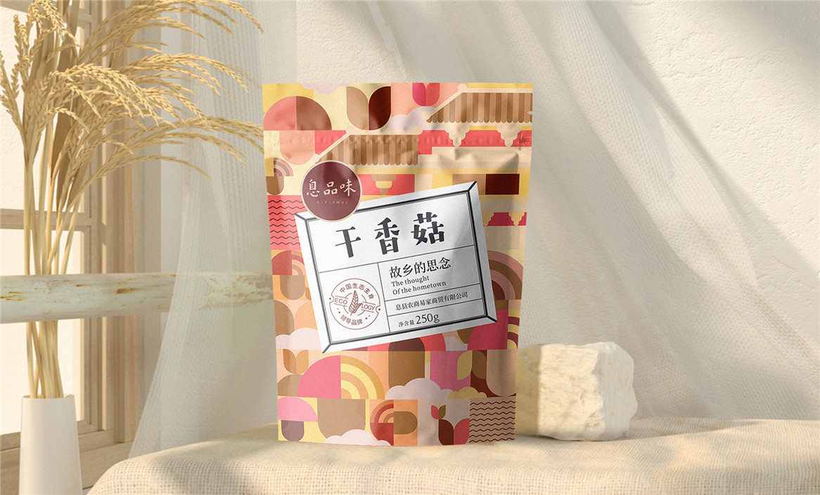 以“故鄉(xiāng)的思念”為品牌溝通語言,從息品味產(chǎn)品生態(tài)特征,地域代表文化、當(dāng)?shù)孛袼酌耧L(fēng)等提取包裝設(shè)計元素,以平面幾何形態(tài)的方式把產(chǎn)品、產(chǎn)地、相關(guān)文化特征進行符號化設(shè)計視覺表達(dá),用一種與當(dāng)下農(nóng)副產(chǎn)品市場不同的包裝表現(xiàn)方式設(shè)計,展現(xiàn)綠色新生活,迎合當(dāng)下消費升級審美升級的新消費趨勢,快速建立品牌認(rèn)知。