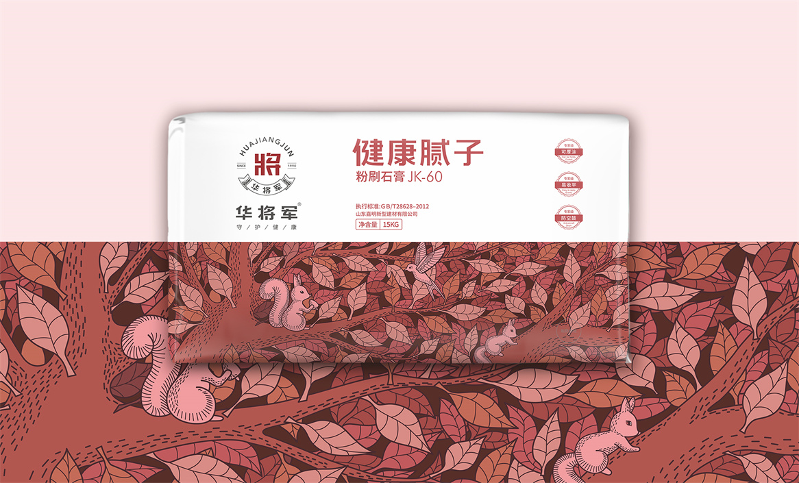 華將軍膩子粉包裝設(shè)計依據(jù)品牌和產(chǎn)品規(guī)劃,以中?端生態(tài)健康膩子為導(dǎo)向設(shè)計與眾不同。首先從包材上用高品質(zhì)的環(huán)保紙袋代替了塑料編織袋;其次從版式上創(chuàng)新的使用橫版設(shè)計區(qū)別于市面上豎版包裝;再就是能夠直觀的視覺表達品牌和產(chǎn)品策略,設(shè)計上我們手繪了枝繁葉茂的大樹、森林以及對環(huán)境要求極高的動物和諧共生的場景,恰當(dāng)直觀的表達了生態(tài)健康的核心理念。